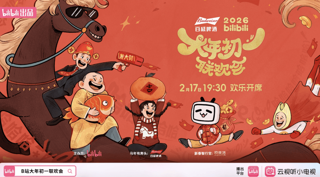 B站入局春节档,“大年初一联欢会”定档2月17日直播 新兴与传统表演形式齐聚一堂,B站首办“大年初一联欢会”。1月27日,B站首次官宣新IP“2026 bilibili大年初一联欢会”(以下简称“B站联欢会”)。