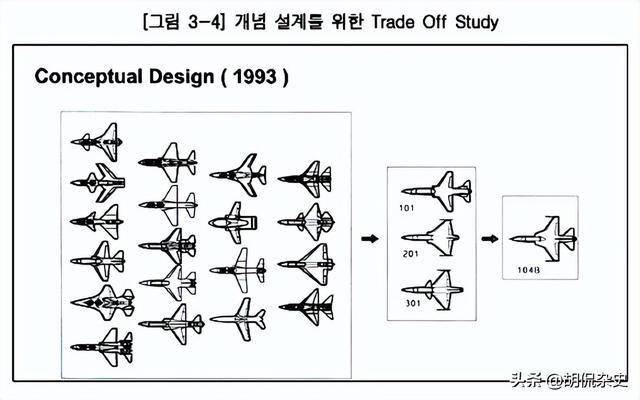 KTX-2飞机的正式要求当时尚未最终确定,围绕飞机的最大速度(亚音速还是超音速)争论仍在继续。101方案是亚音速教练机,201/301方案是超音速教练机。尽管三星公司的主要设计师持不同意见,韩国空军坚持要求飞机具备超音速性能,由此诞生了概念设计CD-104。