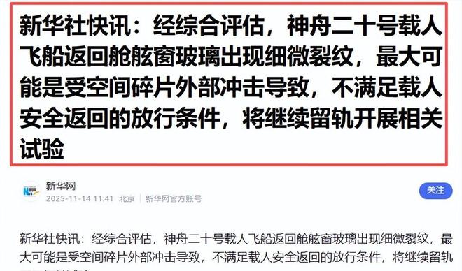 新华社客户端:《神舟二十号航天员乘组即将返回东风着陆场》2025年11月14日财联社:《11月14日电,据新华社,经综合评估,神舟二十号载人飞船返回舱舷窗玻璃出现细微裂纹,最大可能是受空间碎片外部冲击导致,不满足载人安全返回的放行条件,将继续留轨开展相关试验。》2025年11月14日央视网:《神舟二十号航天员乘组返回任务有序推进》2025年11月11日